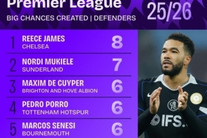 体育资讯4月6日讯 squawka统计了本赛季英超后卫的创造重大机会情况,蓝军队长里斯·詹姆斯领跑。