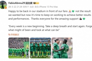 法比奥社媒:现在国安必须继续努力,争取更理想的成绩